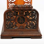 A mid-Victorian walnut bookstand, each finely carved end panel inlaid with initials, the platform inlaid 'Truth', the underside bearing paper label detailed 'Richd Alfred Brangan... London' and incised 'Danl Ruddle. Invt March 1873', width 44cm.