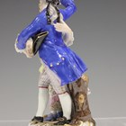 A Meissen figure group of a dancing couple, late 19th century, modelled after Kaendler as a gentleman holding a floral wreath above his companion's head, the naturalistic base with gilt enriched scroll moulded detail, underglaze blue crossed swords, incised 'C.75', height 15cm (minor faults).