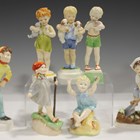 Fourteen Royal Worcester Days of the Week series figures, modelled by Freda Doughty, comprising seven girls Monday through to Sunday, and seven boys Monday through to Sunday, each with black printed mark to base.