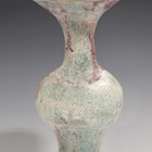 A Lucie Rie studio pottery stoneware bottle vase with volcanic glaze, the baluster body with flared undulating rim, the erupted glaze with copper red details against a blue/grey ground, impressed seal marks to base, height 26cm (minor restoration to rim). Provenance: property of a Sussex private collector.