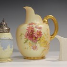 A group of mostly Royal Worcester blush ivory wares, including a jug, painted with a floral spray, circa 1898, height 14cm, and a two-handled vase, painted with apple blossoms and daisies, height 19cm.
