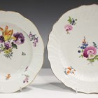 A Meissen soup plate, late 18th/early 19th century, painted with a floral bouquet and scattered sprigs to the basketweave moulded gilt edged rim, crossed swords in underglaze blue to base, diameter 22.5cm, together with a Meissen dinner plate, similarly painted, crossed swords and dot in underglaze blue to base, diameter 24.5cm.