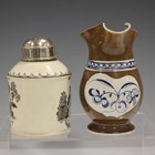 A white metal mounted creamware cylindrical caddy with white metal cover, late 18th century, printed in black with a figural rural scene opposing birds in branches, the cover with engraved 'S v L P F' monogram, height 11cm, together with a creamware teabowl and saucer, polychrome painted with flowers, a pearlware coffee pot and cover, a brown ground pearlware jug, height 13cm, creamware plate, diameter 25cm, and two Leeds Pottery blue printed plates (faults and restoration). Note: it has been suggested the monogram on the cover of the caddy may relate to a pottery fellowship between Swinton and Leeds.