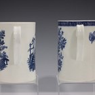 Two Caughley porcelain blue printed tankards or mugs, circa 1780, both of cylindrical shape, the first with La Peche and La Promenade Chinoise patterns, underglaze blue ‘S’ mark to base, height 13.8cm (faint starcrack to base), the second with Parrot Pecking Fruit, underglaze blue ‘C’ mark to base, height 14cm.