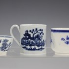 A small Worcester Plantation pattern blue painted mug, circa 1755, with reeded handle, unmarked, height 5.9cm, together with a small group of other Worcester and Caughley, including two teabowls and a saucer in the Three Flowers pattern, a miniature Fence pattern teabowl, diameter 5.8cm, a Fruit printed teabowl and a basket, diameter 12cm, together with a Barr, Flight & Barr Worcester two-handled sucrier, a Caughley cup and saucer with gilt detailed floral decoration, and a blue and gilt decorated teabowl and saucer (minor faults).