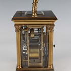 A late 19th century French lacquered brass carriage alarm clock by Margaine of Paris, with eight day movement striking hours, half hours and repeating on a gong, the backplate with stamped maker's mark and numbered '8964', the cream enamelled dial with Arabic hour numerals and subsidiary alarm dial, the glazed case with reeded swing handle above Corinthian corner columns, on bracket feet, height 17.8cm.
