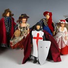 Nine Peggy Nisbet dolls, comprising LE/79 King Richard I, LE/81 Queen Berengaria, LE/82 Standard Bearer, Cornish lavender girl, Cornish violet girl, Nell Gwyn, BR/036 Cries of London Cherry Ripe, LE/80 Eleanor of Aquitaine and LE/73 Lady Sybil, eight with original tag labels.