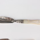 A Victorian silver and mother-of-pearl handled butter knife with engraved decoration, Sheffield 1851 by Aaron Hadfield, length 18.7cm, a silver Venetian pattern butter knife, Sheffield 1897 by James Lewis & Sons, length 13.5cm, and three other silver butter knives, various dates and makers, weighable items 28.3g.