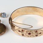 A gilt metal and garnet oval hinged bangle with floral decoration, on a snap clasp, inside width 6.1cm, a 9ct gold mounted circular pendant locket, London 1985, a 9ct gold and yellow paste solitaire ring, total weight 9.1g, a gold back and front, seed pearl and red gem set circular pendant locket, weight 5.4g, a colourless paste circular pendant locket and a blue paste set bar brooch.