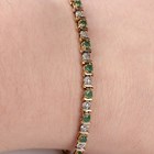 A 9ct gold, emerald and diamond bracelet, mounted with a row of circular cut emeralds alternating with circular cut diamonds, on a snap clasp, weight 6.3g, length 18.5cm.