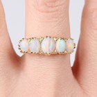 An Edwardian 18ct gold ring mounted with a row of five graduated oval opals, with five pairs of diamond points mounted at intervals, Birmingham 1906, weight 4g, ring size approx P.