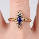 A late Victorian 18ct gold, diamond and blue paste set marquise shaped cluster ring, mounted with three blue pastes within a surround of rose cut diamonds, with scroll decorated shoulders, Birmingham 1899, weight 3.3g, ring size approx P1/2.