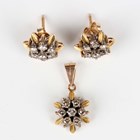 A gold and diamond seven stone cluster pendant, unmarked, length 2.5cm, and a pair of gold and diamond seven stone cluster earstuds in a matching design, with threaded post and screw butterfly fittings, unmarked, diameter 1.5cm, total weight 9.9g, with an associated case.