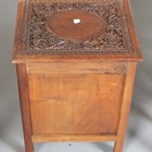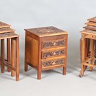 A late 20th century Kashmiri carved walnut table-top chest of drawers, height 41cm, width 32cm, depth 31cm, together with two similar nests of occasional tables, all finely carved with foliage.