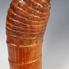 An early 20th century Japanese carved bamboo figure of Buddha, height 38cm, a red lacquered box and a gnarled root.