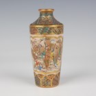 A Japanese Satsuma earthenware vase by Seikozan, Meiji period, of shouldered tapering cylindrical form, painted and gilt with panels of arhats, children and bijin, within borders of simulated brocade, gilt Kozan Sei (shortened form of Seikozan) and impressed signatures to base, height 13cm.