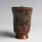 A Chinese gilt decorated brown ground porcelain libation cup, mark of Qianlong but later Qing dynasty, the exterior decorated with a design of gilt lotus and scrolling tendrils, applied with a chilong forming the handle, turquoise glazed interior, iron red enamelled seal mark to base, height 8.2cm, together with a Chinese famille rose enamelled porcelain belthook of typical serpentine form, painted with a bat supporting a pendant and scrolling tendrils on an incised ground, length 8.3cm.