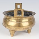 A Chinese brown patinated bronze tripod censer, Qing dynasty, of low-bellied circular form on three short feet, weight 475.6g, height 7.6cm, rim diameter 12.7cm, together with a polished bronze tripod censer, weight 548.7g, height 10.1cm, rim diameter 11.5cm.