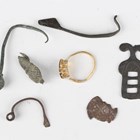 A collection of various metal detector-found coins, including Roman and hammered (most in ground-found condition), including a Roman Republican denarius, a Henry III long cross penny and a small group of later milled silver coins, including a George I sixpence 1723, a George I silver penny 1723 and a George II twopence 1739, together with a small group of artefacts found by the vendor's father during the 1970s, including a damaged post-medieval gold ring, weight 1.5g (enamelled areas heavily damaged, principal stone lacking), and an attaché-style case.