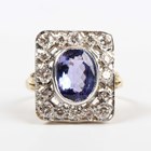 A gold, tanzanite and diamond panel shaped ring, collet set with the oval cut tanzanite within a pierced surround mounted with circular cut diamonds, unmarked, weight 6.7g, tanzanite weight approx 2.00ct, ring size approx O1/2, with a case.
