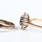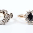 A gold and diamond panel shaped ring, mounted with five circular cut diamonds, unmarked, weight 1.8g, ring size approx L1/2, a gold, sapphire and diamond ring, unmarked, weight 2.8g, a 9ct gold, sapphire and colourless gem set oval cluster ring, weight 2.5g, and a cultured pearl and colourless gem set ring.