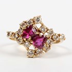 An 18ct gold, ruby and diamond ring, claw set with two pear shaped rubies, otherwise set with circular cut diamonds in a twist design, import mark London 1987, weight 4.3g, ring size approx P.