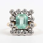 A gold and platinum, emerald and diamond cluster ring, claw set with the cut cornered rectangular step cut pale emerald within an openwork surround, collet set with twelve circular cut diamonds, detailed ‘Plat’, weight 7.3g, emerald weight approx 3.80-4.00ct, total diamond weight approx 0.80-1.00ct, ring size approx T1/2, with a case.