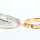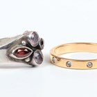 A 9ct gold, sapphire and diamond ring, claw set with the oval cut sapphire between diamond three stone shoulders in a scrolling design, London 2000, weight 3g, ring size approx P, four silver and gem set rings and a Swarovski Crystal eternity ring.