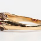 An 18ct gold, diamond and synthetic ruby ring, mounted with three oval cut synthetic rubies and two pairs of diamonds, weight 3.9g, ring size approx R1/2, with a box.