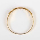 A gold, ruby and half-pearl ring, mounted with three rubies alternating with two half-pearls in square shaped settings, detailed ‘BH 18ct’, weight 1.9g, ring size approx N1/2.