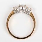 An 18ct gold and diamond three stone ring, claw set with old cut diamonds, the principal diamond mounted at the centre, weight 4.6g, total diamond weight approx 1.30-1.40ct, ring size approx P, with a case.