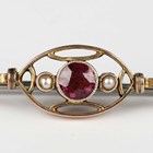 A 9ct gold, sapphire and cultured pearl brooch of circular design with tied bow motifs at intervals, London 1987, diameter 2.8cm, a 9ct gold mounted oval shell cameo brooch, carved as a portrait of a lady, and a gold, garnet and seed pearl bar brooch, detailed ‘9ct’, total weight 11.7g.