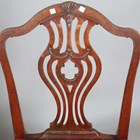 A pair of George III Chippendale period mahogany dining chairs with pierced splat backs and overstuffed seats, height 97cm, width 55cm.