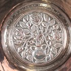 An early 20th century Arts and Crafts plated copper deep welled dish, in the manner of Omar Ramsden, the central boss finely worked with a twin-handled urn of roses, the flattened rim with a beaded edge, raised on five squat feet, diameter 28cm.