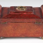 A Regency red stained Morocco leather casket of sarcophagus form with pressed brass mounts and ball feet, width 14cm.