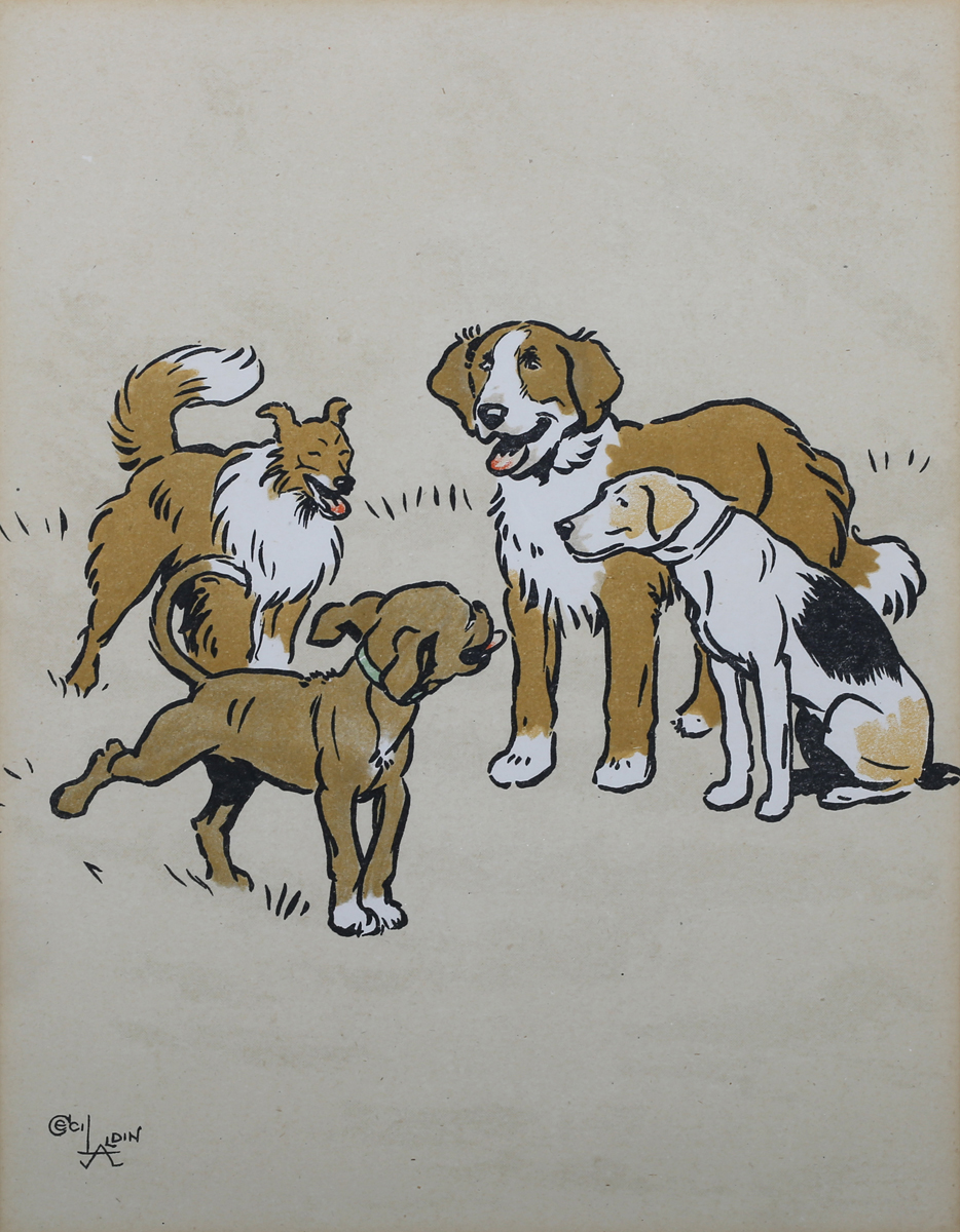 Cecil Aldin – The Dog Who Wasn’t What He Thought He Was, three early 20th century chromolithographs, each 19.5cm x 15cm, all within stained wood frames.