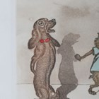 Boris O’Klein – ‘Chacun son Tour’, 20th century etching with aquatint and hand-colouring, signed and titled in pencil, 18cm x 45cm, within a stained wood frame, together with six similar humorous dog cartoon etchings by the same hand.