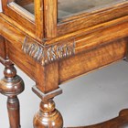 A pair of early/mid-20th century Queen Anne style walnut display cabinets, the arched tops above glazed doors and mirror interiors, the stands finely carved with scallop shell aprons, on turned legs united by shaped 'X' stretchers, height 236cm, width 127cm, depth 36cm.