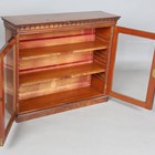 A fine early Victorian flame mahogany table-top or wall-hanging cabinet, in the manner of Gillows of Lancaster, the carved petal pediment above two glazed doors enclosing two adjustable shelves, height 68.5cm, width 82cm, depth 24cm.