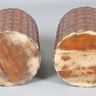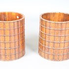 A pair of 20th century hardwood waste paper baskets, the sides carved and detailed in gilt to imitate spines of books, height 35.5cm, diameter 32cm.