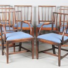 A set of eight George III Sheraton period mahogany framed dining chairs, comprising two carvers, height 89cm, width 58cm, and six standards, height 88cm, width 44cm.