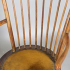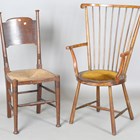 An Edwardian beech stick back armchair, on turned legs, height 103cm, width 55cm, together with a William Birch oak panel back chair with rush seat.