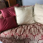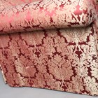 A modern three-seat sofa by J. Robert Scott, upholstered in foliate patterned claret damask, height 83cm, width 250cm, depth 106cm.