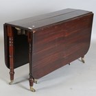 A Regency mahogany concertina-action extending dining table, in the manner of Wilkinson of Moorfields, London, the top with two fall flaps and three extra leaves, raised on ring turned legs and castors, height 73cm, extended length 305cm, depth 122cm (faults).