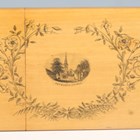 A Victorian Mauchline ware visiting card case with titled view of 'Petworth Church', length 11cm, together with two small Mauchline boxes with titled views of castles.