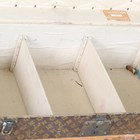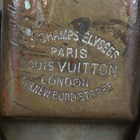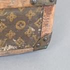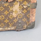 An early 20th century Louis Vuitton travelling trunk with overall monogram canvas covering and tan leather strapping, the interior with original lift-out tray and maker's label, bearing serial number '759307', height 34.5cm, width 81cm, depth 48cm.