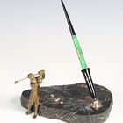 A 20th century plated cast metal novelty inkwell in the form of a golfer in full swing, height 13cm, together with another golfing inkwell and a pen stand with golfer surmount, raised on a marble plinth.
