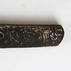 A 19th century Japanese katana with curved single-edged blade, blade length 58cm, the tang signed to one side, and lacquer bark-effect grip, with similarly covered wood scabbard (split to grip), together with another 19th/early 20th century Japanese sword with straight single-edged blade, blade length 55cm, the tang unsigned, and lacquer bark-effect grip, with similarly covered scabbard (overall losses to covering).