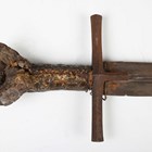 An unusual 19th century Sudanese Mahdist kaskara sword with double-edged fullered blade, blade length 93cm, and T-shaped square-section crossguard, the grip covered with a crocodilian foot, the scabbard also covered with crocodilian skin.