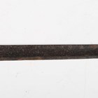 A George III period dress sword with single-edged blade, blade length 81cm, engraved with coat of arms and trophy of arms, half-bowl guard and moulded wrythen brass grip (rust patches to blade, knuckle bow detached at pommel end), together with two 19th century Indian tulwar swords with typical curved blades, steel guards and grips, both with leather-covered scabbards (both tulwars rusted overall).
